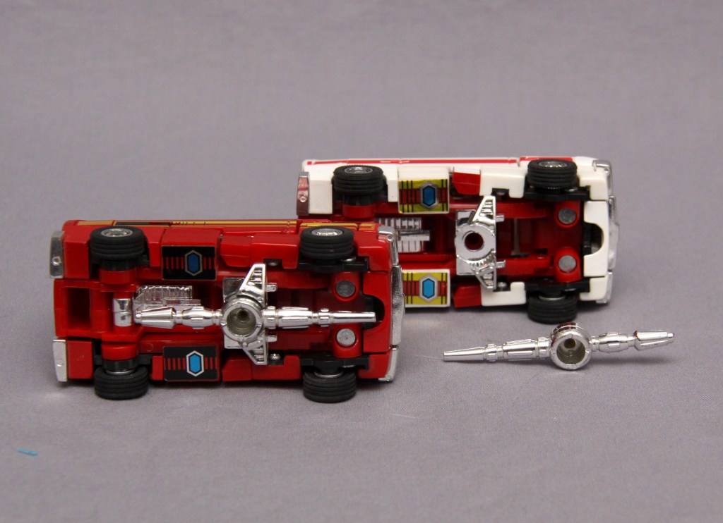 Both figures can store their “static laser gun” accessories in a port located on the underside of their van modes, representing a (very) rare weapon storage feature for an early Transformers figure. Unfortunately, this feature doesn’t really work on the Encore versions – not only are the peg holes too loose, the guns themselves protrude below the wheels.