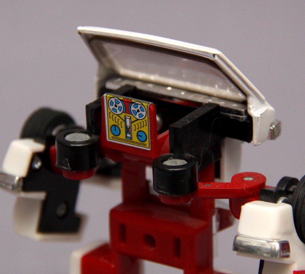 Infamously, Ratchet and Ironhide have essentially no head sculpt. Behind the clear windshield is a small red tab with a sticker bearing a vaguely robotic face design. I couldn’t really capture the face behind the glinting windshield, but you can see it in ToyHax’s label sheet for Ratchet. The package artwork adds an embellished detail of the faces’ “eyes” reflecting on the windshield to make it seem more like these robots has identifiable heads. The face labels weren’t present on the original Diaclone figures.