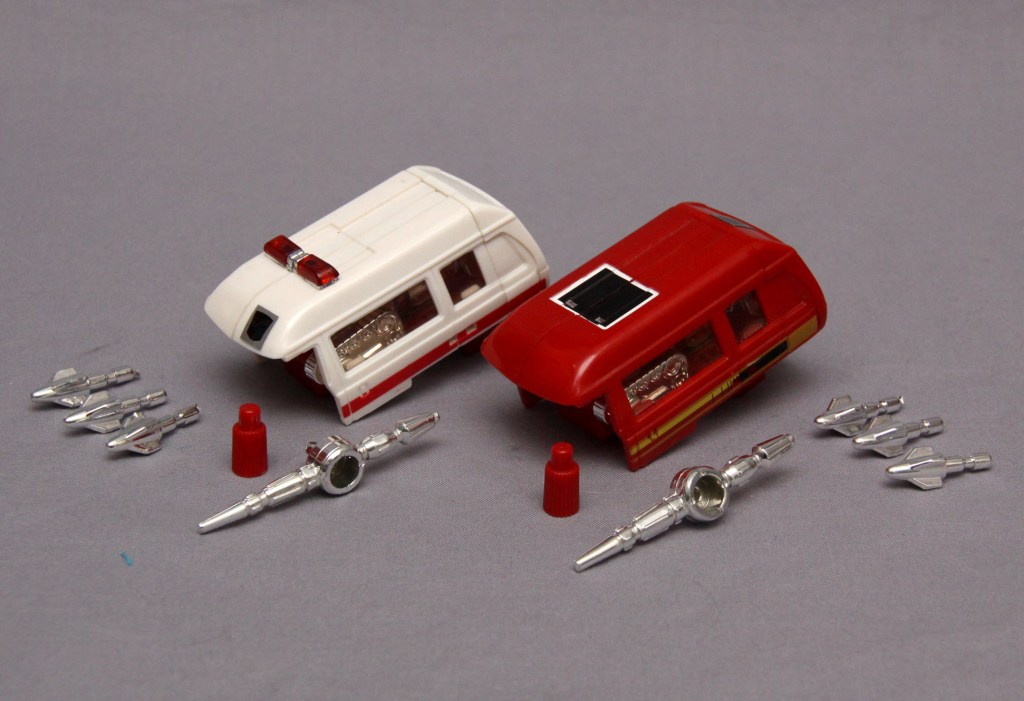 Both Autobots come with the upper part of their van mode, a chrome “static laser gun,” a red gun mount, and three chrome missiles.