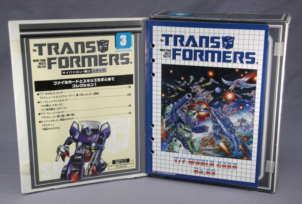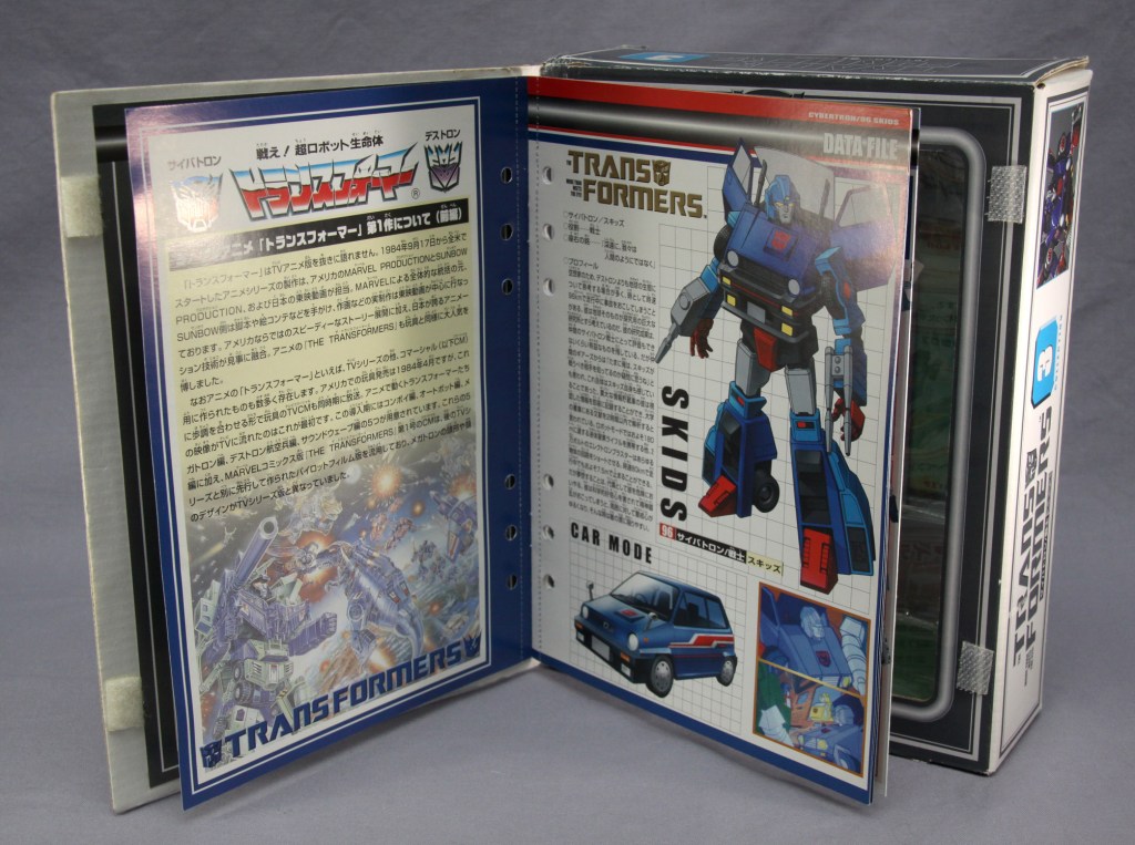 The front panel of the box opens like a window and is held shut by two velcro pads. Rather than simply a view of the toy inside, each box came with several pages of a guidebook called “T/F WORLD CARD.” This booklet featured original artwork, photography of other G1 figures, an episode guide for the G1 cartoon, character bios, and other neat stuff.
