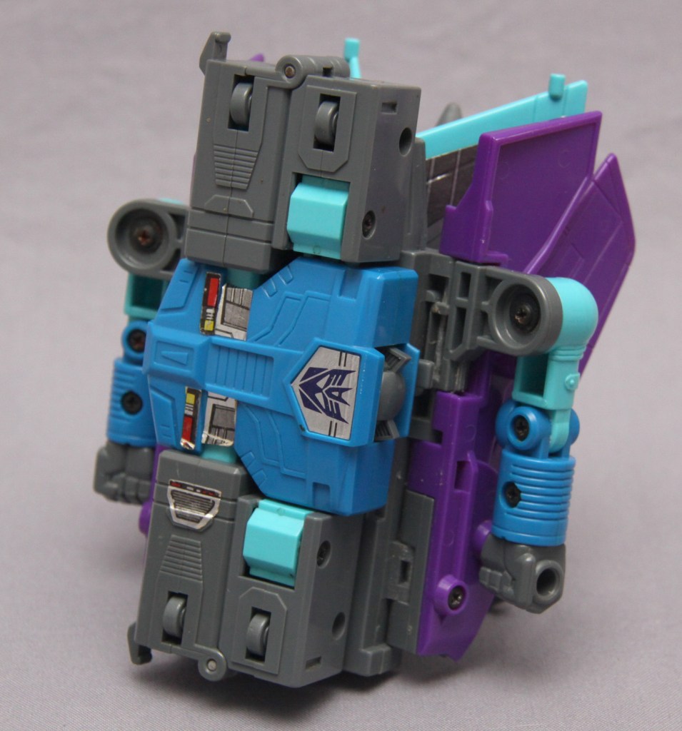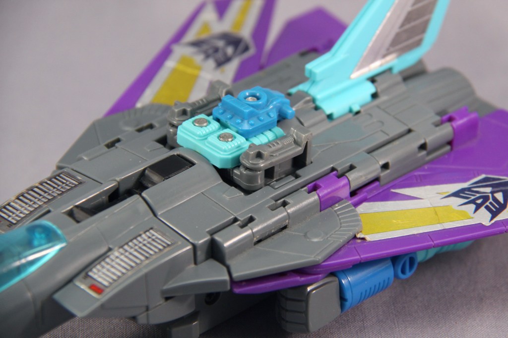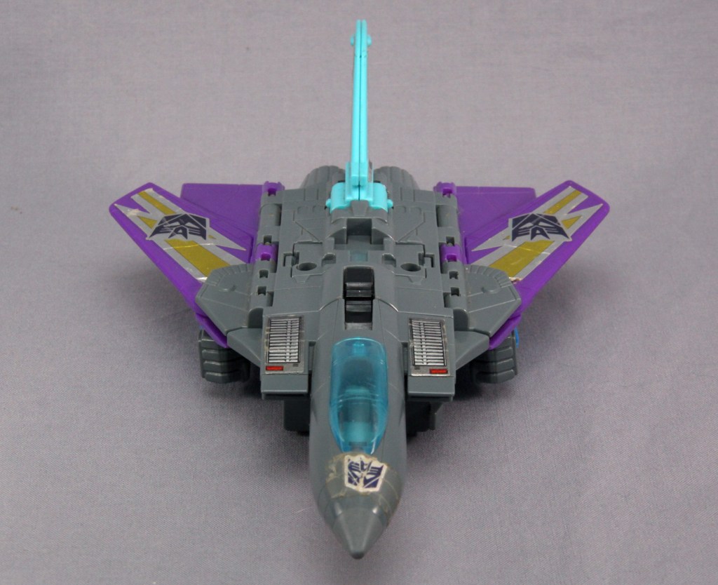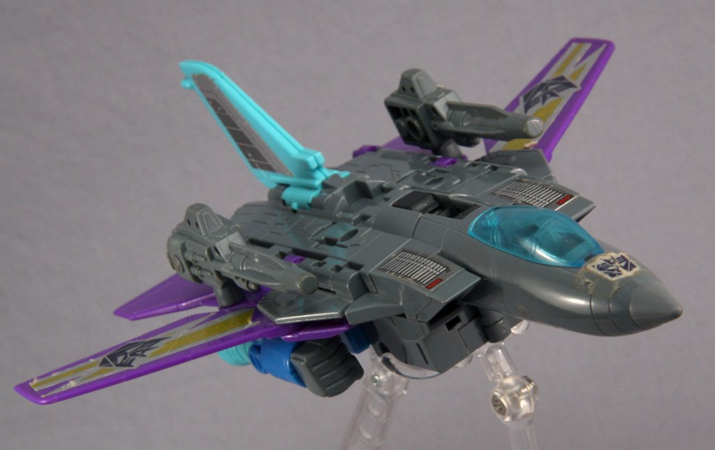 The wings can swing down for a swept-wing configuration, much like the real Tornado. Fitting for a Decepticon whose function is assault, since this wing mode means he’s gonna go extremely fast, likely to catch up with an arrogant Autobot flier like Powerglide.