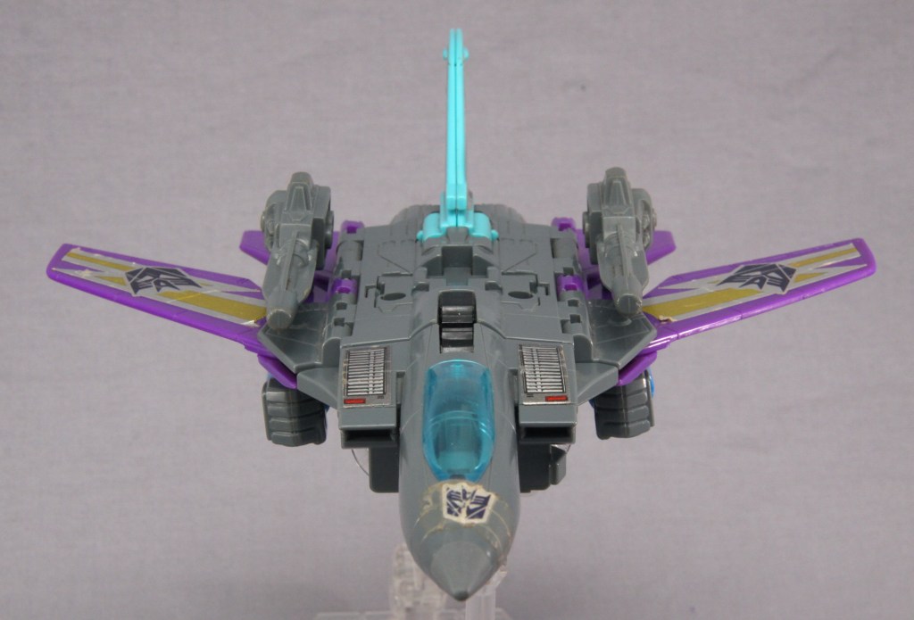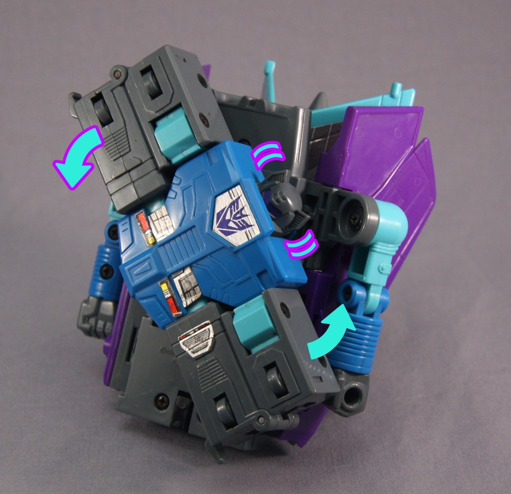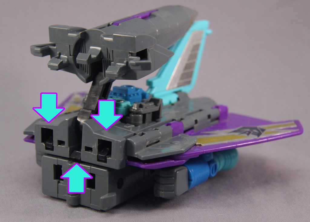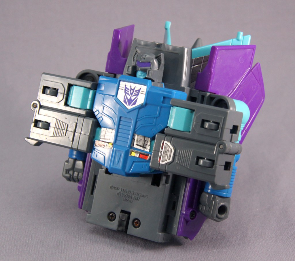 The wings can swing down for a swept-wing configuration, much like the real Tornado. Fitting for a Decepticon whose function is assault, since this wing mode means he’s gonna go extremely fast, likely to catch up with an arrogant Autobot flier like Powerglide.