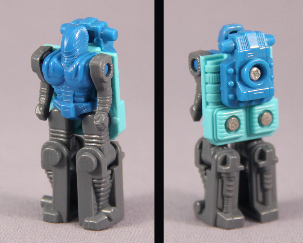 Throttle has articulation at the shoulders, but the small pegs that hold the arms on are susceptible to breakage when the shoulder pushes against the backpack, and these guys ain’t easy to replace, so I just don’t move the arms. The legs can also pivot outward thanks to the transformation.