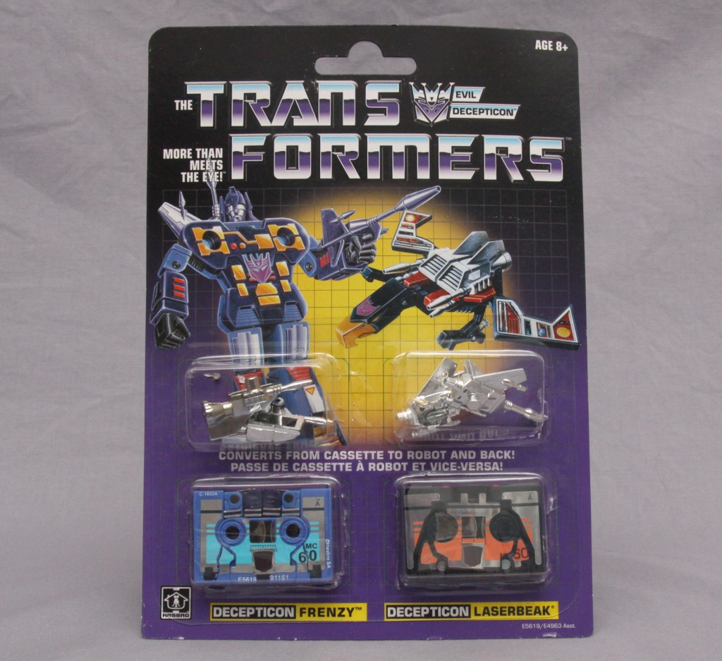While the Autobots’ lowest price point members were packaged individually, the cassettes came in two-packs like this. Hasbro’s 2019 reissues of the G1 cassettes faithfully reproduces the style of the 1980s packaging, with the figures packaged in cassette mode and their weaponry stored in separate blisters.