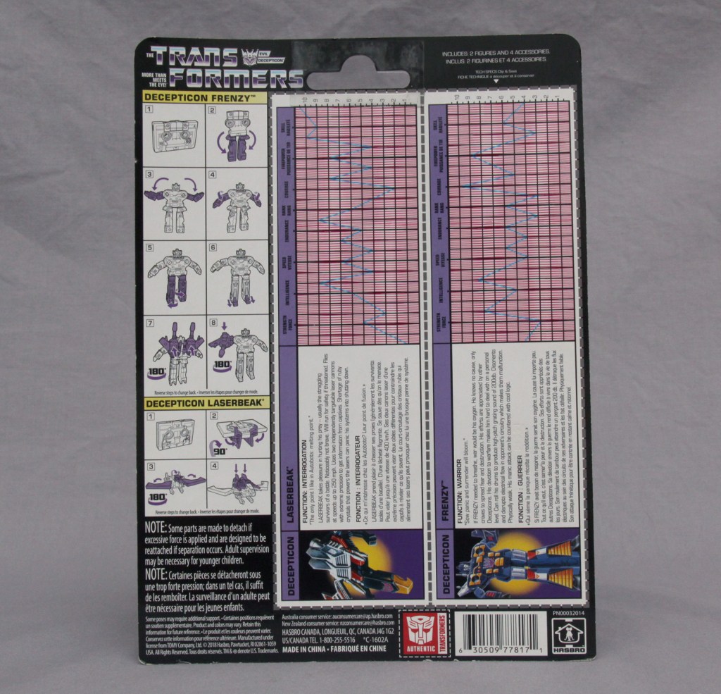 Both figures have die-cast metal in their construction. In Frenzy’s case, it’s his feet as well as the joints inside his elbows and shoulders. Laserbeak’s entire back piece is metal.