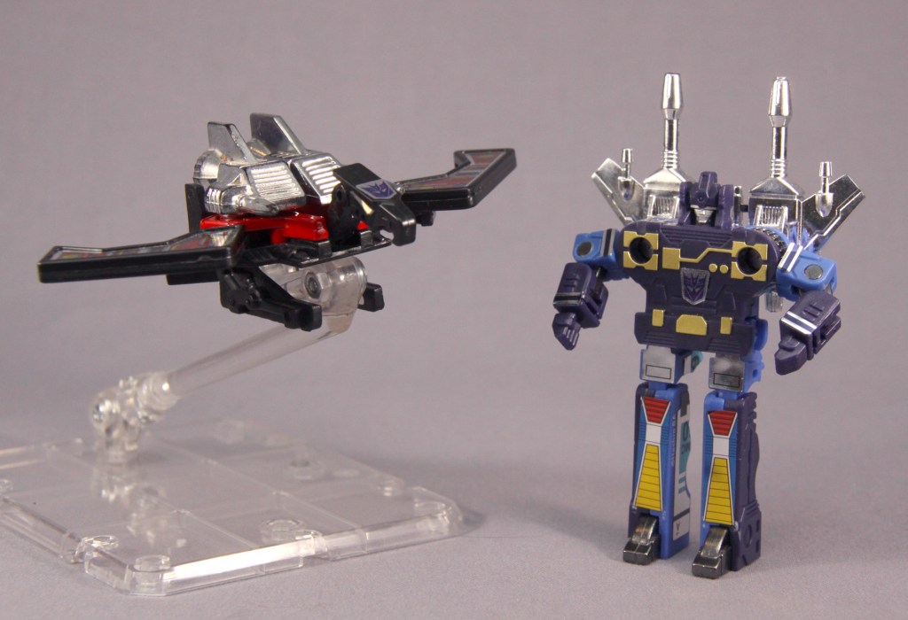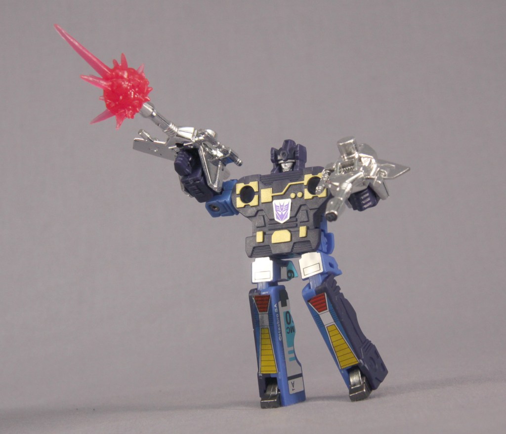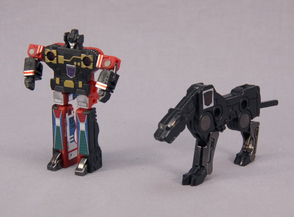 In robot mode, both of these cassettes are among the smallest Decepticon figures from 1984, but the added weapon accessories make them feel more threatening than the similarly sized Autobot mini-vehicles.