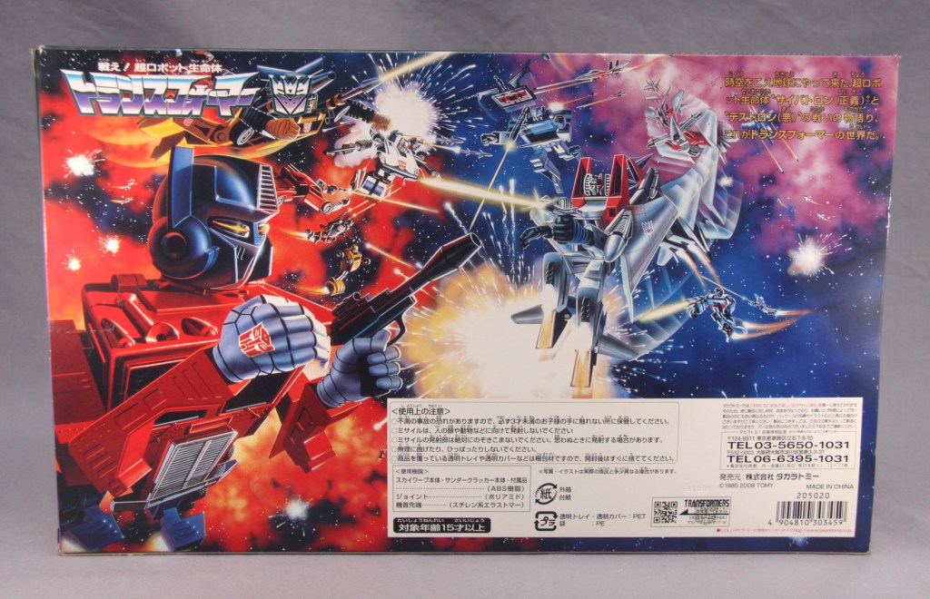 The Encore packaging reuses the original 1980s box art and the callouts from the Japanese release. Skywarp’s says “Attacks the Cybertrons with warp ability!” and Thundercracker’s says “Attacks the Cybertrons soundlessly!” (I don’t get this one, since Thundercracker is supposed to create sonic booms by flying really fast – maybe it’s supposed to mean he deafens the Autobots?)