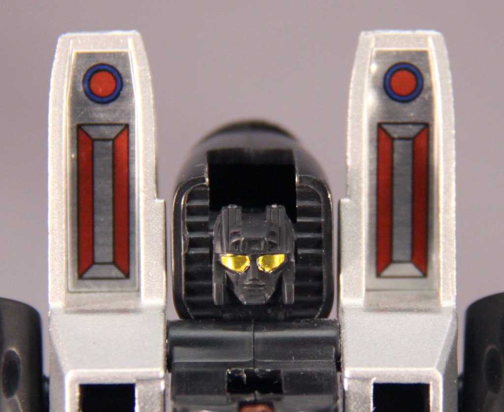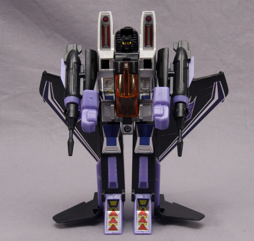 While both Starscream and Thundercracker’s deco comes from Diaclone toys, Skywarp’s deco is completely original to Transformers. Purple is generally considered to be the main color of the Decepticon army, and Skywarp here is the only Decepticon toy from 1984 to have purple in his color scheme.