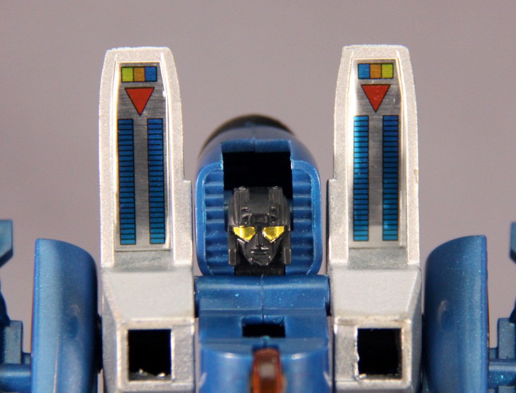 The head seems far too small for the body unless we consider the bottom of the nosecone to be part of the helmet. The gold eye details are stickers, and whoever owned this Thundercracker before me carefully cut them out and applied them in the eye sockets, which makes them look way better than most others I’ve seen.
