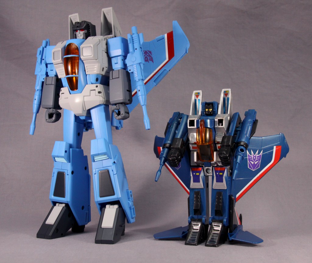 Compared with Transformers Masterpiece MP-52+TC Thundercracker. The newer MP version also takes its design cues from the animation, down to the two black squares which represent the nylon joints on the top of the original toy.